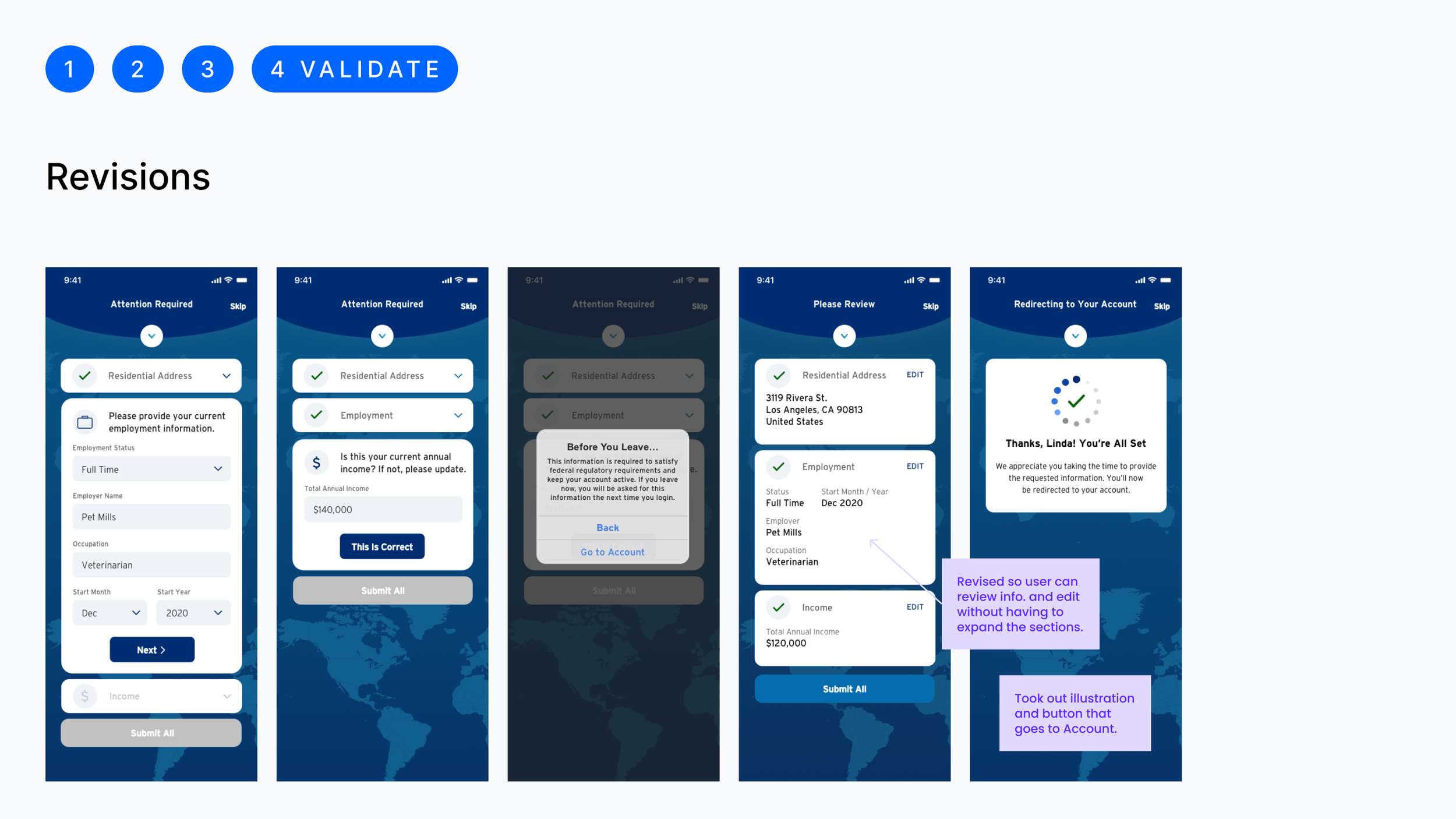 I reviewed the existing screens for the responsive web and quickly mapped out a user flow, outlining the key sections of information required—residential address, employment details, and income. We didn’t want to force them to complete everything at once but allow them to see their account.