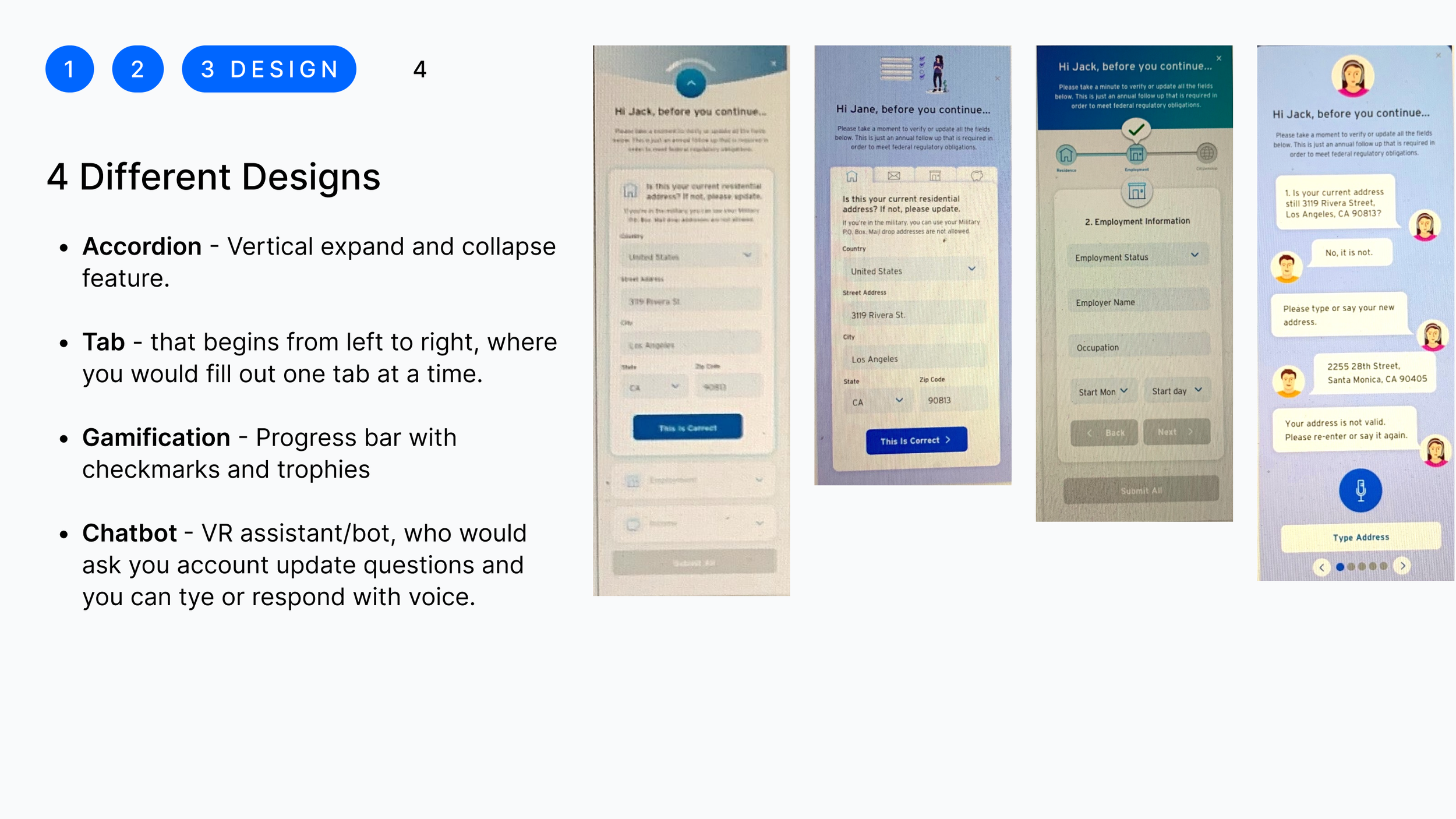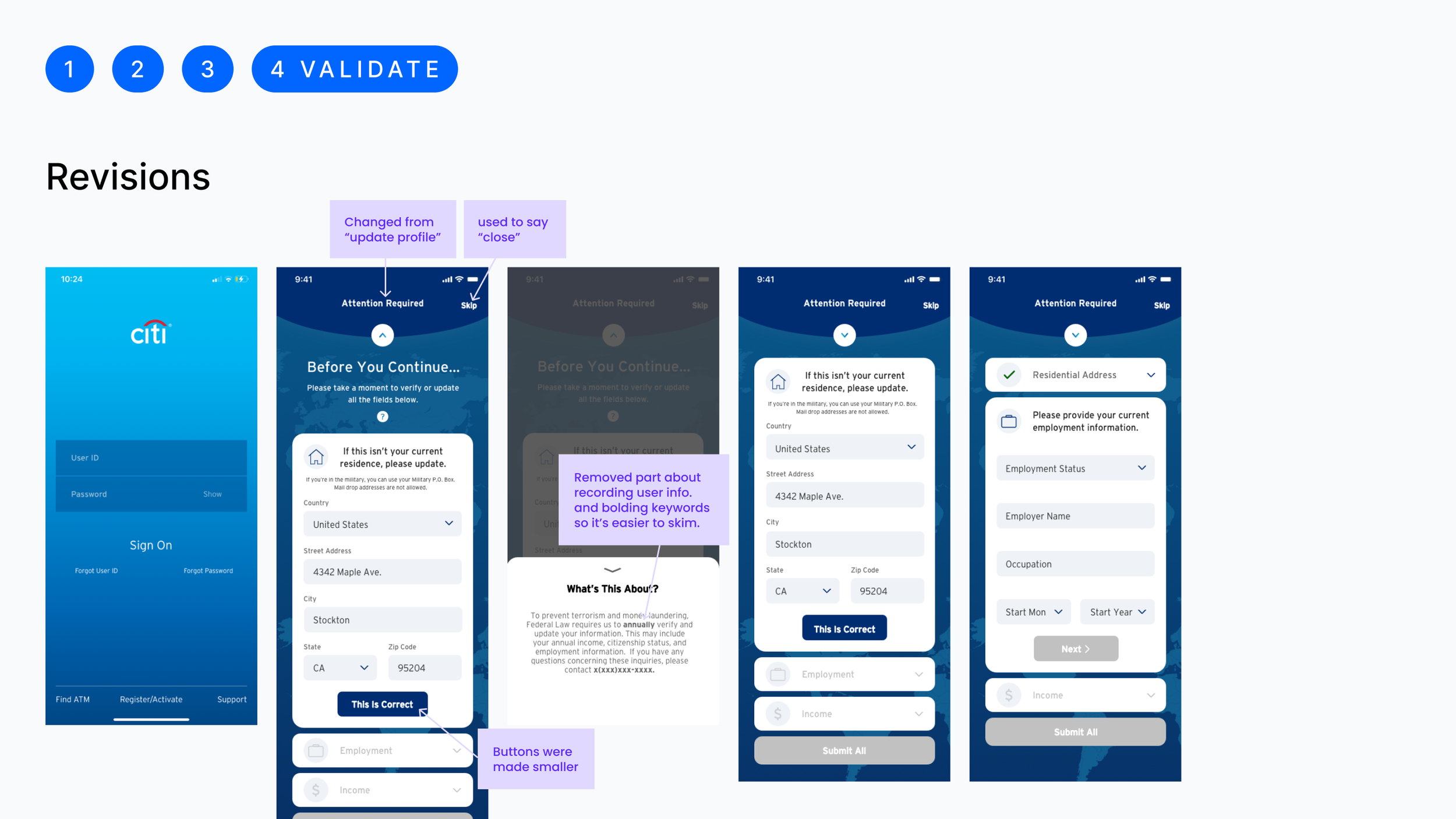 The Product Owners chose one design from both my coworker and myself. Out of my designs, the journey owners were most interested in exploring the accordion design that would help limit the amount of scrolling. I adjusted the colors to follow Citi branding. We also got some pushback from the developers requesting to limit the number of illustrations due to size and load time considerations. The journey owners chose a tab design from my coworker, Crystal. The plan was to test both designs and see which one performed better. We also worked with our copywriter to test two different versions of copy, one for each design.